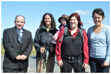 Michel Poulin, maire, Nathalie Poirier, coordonnatrice CAL-QEF, Patricia Carrier (CAL-QEF) avec la petite Koralie Boulet, confortablement installée dans son porte-bébé, ainsi que Geneviève Lalonde, répondante École en santé (CAL-QEF).
