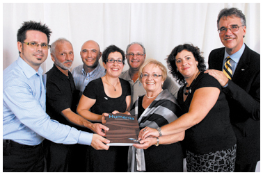 Les membres du comité responsable du livre du 125e de Lac-Mégantic en compagnie de la mairesse Colette Roy Laroche. Dans l’ordre habituel, Charles Rodrigue, Paul Dostie, Éric Ménard, Nathalie Bastarache, Richard Michaud, Colette Roy Laroche, Nathalie Michaud et Yvan Plamondon.