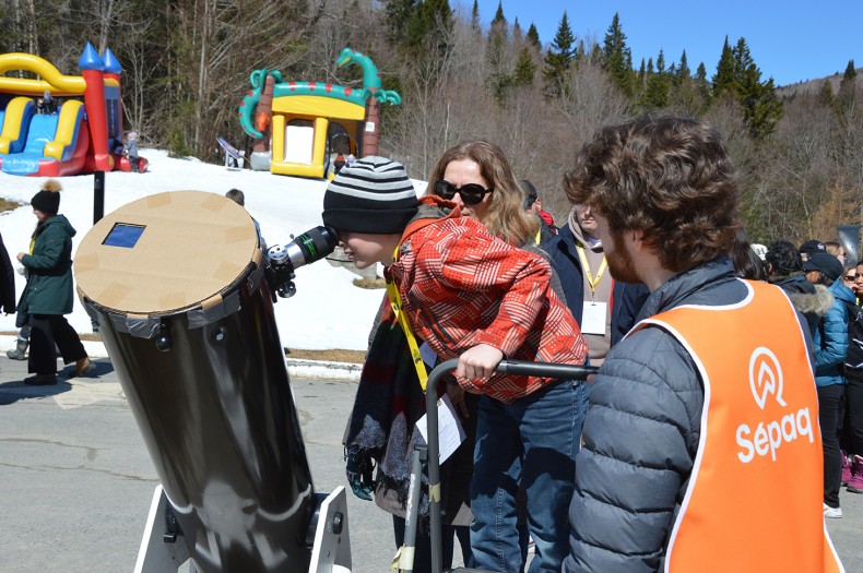 Télescopes de toutes tailles installés près de l’ASTROLab, circulation incessante jusqu’au site d’animation, partout la sensation d’une pure joie cosmique, comme le dira Julie, l’une parmi la trentaine d’anciennes animatrices à l’ASTROLab, qui avaient répondu à l’appel de la Société des établissements de plein air, la SEPAQ ayant elle-même ramené en renfort pour la journée une centaine de ses employés des autres parcs nationaux.