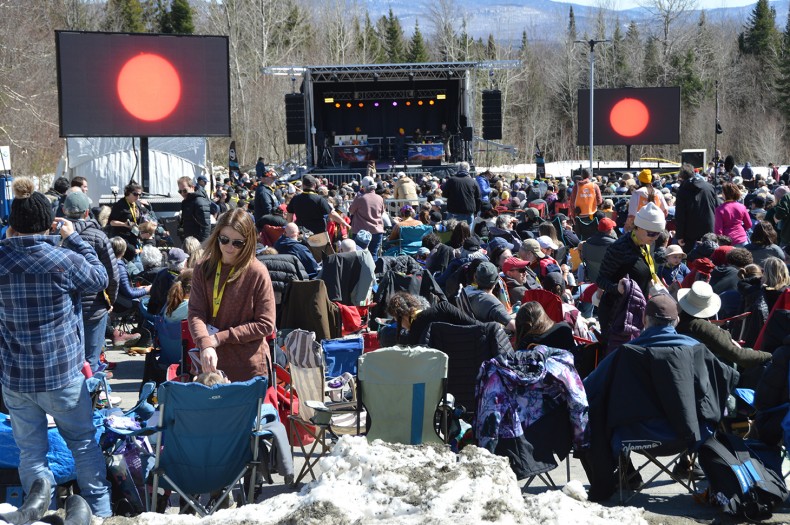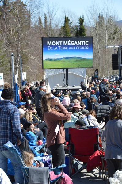 Face à la scène installée dans le stationnement de l’accueil du parc national du Mont-Mégantic, la foule suit en direct sur écrans géants la folle escapade de la Lune vers le Soleil. (Photo Rémi Tremblay)