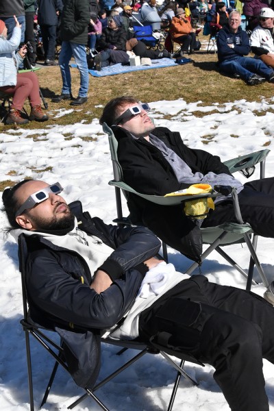 Le Mont-Mégantic et la région ont été bénis des dieux. Ciel bleu magnifique, jusqu’à 12 degrés C, sauf au moment de la chevauchée de la Lune sur le Soleil, où la nuit s’est empressée sur la météo, avec une chute observable de près d’une dizaine de degrés. Mais, pour certains qui avaient oublié la crème solaire ou la casquette, le mal était déjà fait, un coup de soleil bien imprimé sur le visage.