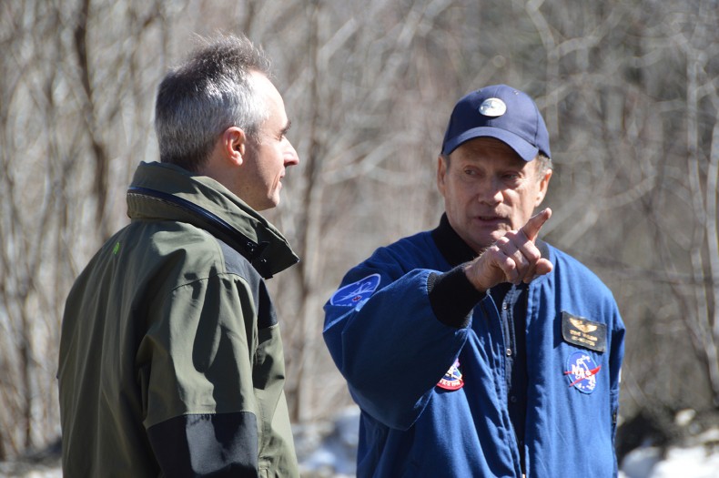 À gauche, Sébastien Giguère, coordonnateur scientifique et responsable de l’éducation au parc national du Mont-Mégantic, en compagnie de l’astronaute canadien Steve MacLean, de l’Agence spatiale canadienne, qui a amené dans l’espace un fanion à l’effigie