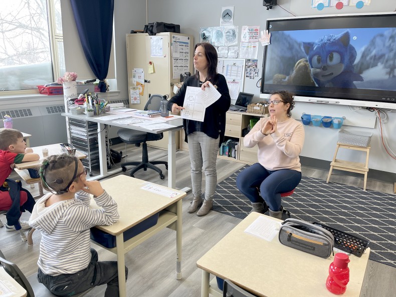 Dans sa classe de 1re année, Léo regarde attentivement Sandra. Concentré sur ses explications, il apprend de front des notions académiques et des connaissances supplémentaires en LSQ, la langue des signes du Québec. À ce jour, Léo a les mêmes acquis que les autres élèves de Mme Isabelle. Sa grande persévérance et la super équipe que forment son interprète et son enseignante composent la recette gagnante de sa progression.