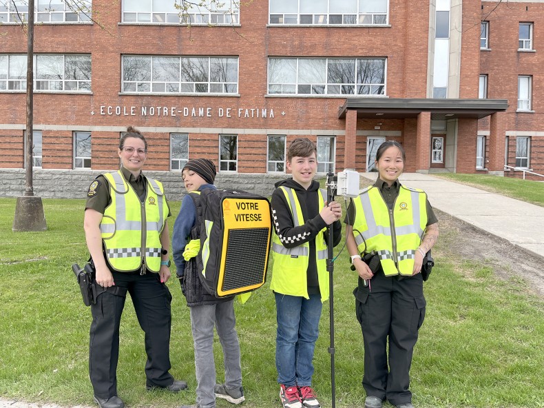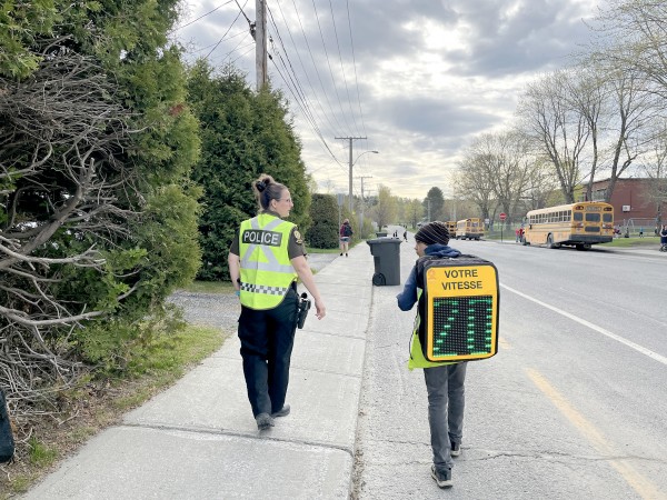 Pour l’activité du 15 mai, Laurent, porteur du cinémomètre, était accompagné de la sergente Lemay durant ses allers-retours devant l’école tandis que l’agente Alice Gagnon était aux côtés Jérémy, qui tenait l’antenne.