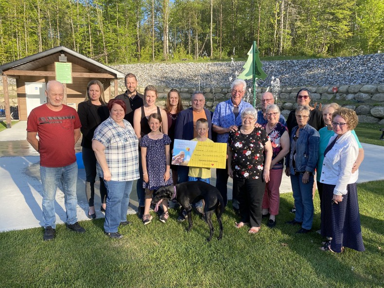 Remise du chèque de 3 830 $ pour l’opération Enfant Soleil, en compagnie des bénévoles et parents. Le petit Emrick tenant le chèque en compagnie des maires de Nantes, Daniel Gendron et de Milan, Jacques Bergeron.