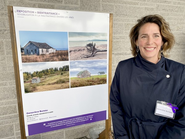 Elle poursuit sur son œuvre, qui présente quatre photos prises en Gaspésie. «Ces photos symbolisent les conséquences de la maltraitance et les sentiments que celle-ci provoque chez les individus. Une souche déracinée évoque l’arrachement, les bâtiments ancestraux abandonnés traduisent la solitude, l’abandon et l’oubli. On peut voir ces photos comme des métaphores de la maltraitance et de notre responsabilité individuelle et collective. Ces photographies nous incitent à regarder la réalité en face, à ne plus se fermer les yeux sur la dégradation, la détresse, la désolation. Les photos appellent le spectateur à porter attention et à prendre soin des aînés et de l’héritage qu’ils nous lèguent».